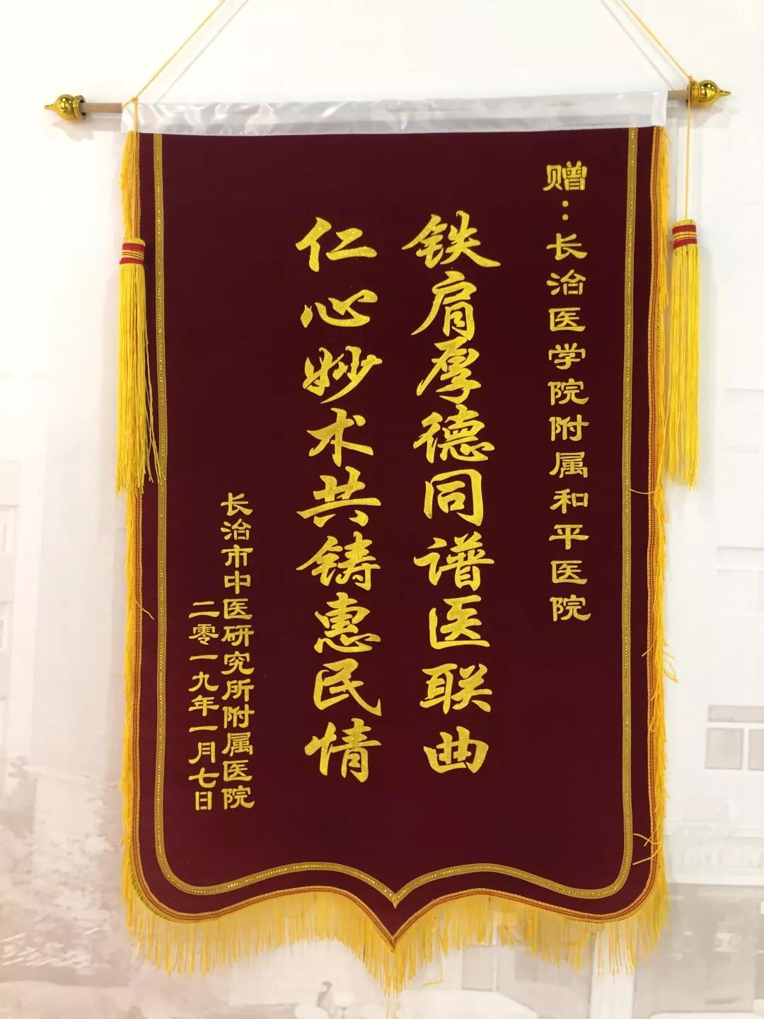 近日,长治市中医研究所院长李樊荣把一面绣有“铁肩厚德同谱医联体 仁心妙术共铸惠民情”的锦旗交到了我校附属和平医院院长尚进平手中,并对医院的无私援助和技术支持表示衷心感谢。